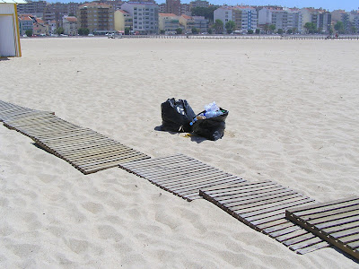 É que, em frente a um dos restaurantes no areal da Figueira da Foz, em frente ao edifício do BPI, na Avenida do Brasil, as passadeiras estão a monte, não há contentores, e, como pode ver-se, já agora, na última imagem, o que, em tempos, foi um banco para descanso, está transformado em parque de bicicletas...porque o assento desapareceu.